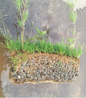 KZ顆粒是本產品主要組成部分,它是一種以無機材料為主,加入利于植物生長的有機質,富含氮、磷、鉀等營養物質,再經過快速固化,制成一種內部呈蜂窩孔洞結構的顆粒材料,該顆粒材料強度較高,耐水流長期浸泡沖刷,材料本身包含可供植物生長的營養成分,也可以儲存足夠的水分養分,同時結構多孔,利于植物根須穿透吸收營養及水分。