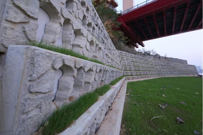 KZ砼生態塊是大型重力式整體連鎖型混凝土護坡砌塊,具備邊坡防護與綠化功能。適用于河道邊坡以及道路邊坡的邊坡穩定處理。結合錨桿的錨固處理,可適應大部分的邊坡處理工程,特別是經常受水流沖刷的河道水位變動區和受到暴雨沖刷的道路邊坡部分,由于KZ砼生態塊具有穩定植被、抗沖刷的特殊功能,所以在防止水土流失、及時有效恢復邊坡植被,提高邊坡穩定性等方面具其它混凝土砌塊所不可替代的功能。